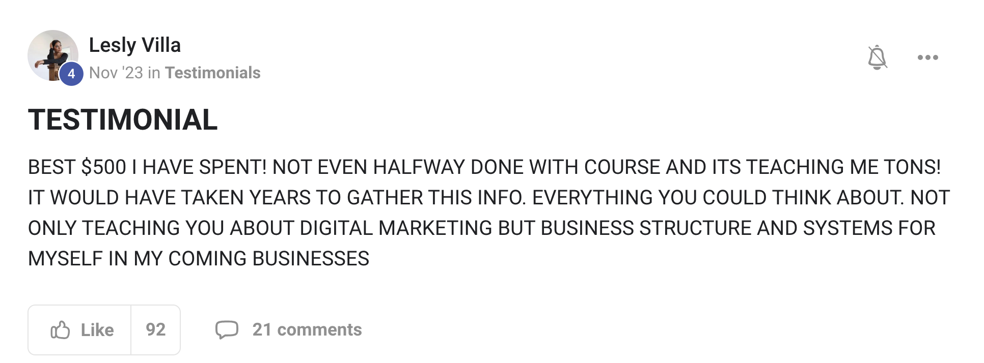This course actually comes with its own community of 20,000+ people where you can ask questions & network. In addition to that, if you get the course with me, you will be added into my PRIVATE CHANNEL youll receive my personal phone number & an optional group chat with weekly calls! I want to see you become a success story!