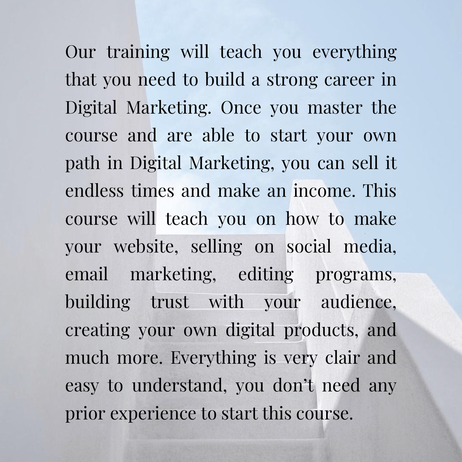 This is a comprehensive marketing course designed for beginners (even with no experience) to learn how to launch a successful digital marketing business. This is a DONE-FOR-YOU in-depth marketing course. The course includes step-by-step modules that will walk you through launching your digital product business and how to use digital marketing to make sales. You will learn how to brand yourself, perform well on SEO, market on various social media channels, how to create highly converting sales funnels, email campaigns and everything else you need to create a profitable passive income business. This product is unique because once you buy it you own it. This means you can re-brand and sell it for 100% profit.